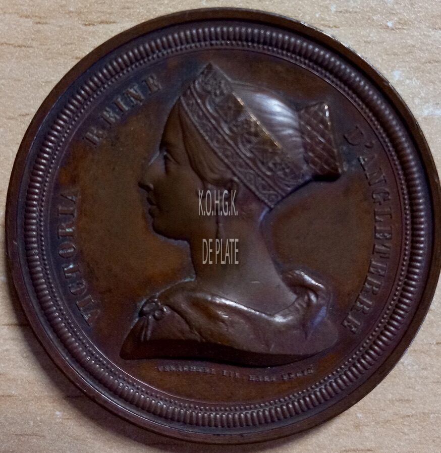Op de voorzijde : Centraal het borstbeeld van koningin Victoria van het Verenigd Koninkrijk naar links gericht, ze draagt een kroon en oorbellen, rondom links VICTORIA REINE, rondom rechts D’ANGELETERRE, Onder de buste gesigneerd VERACHTER DIR. HART FECIT