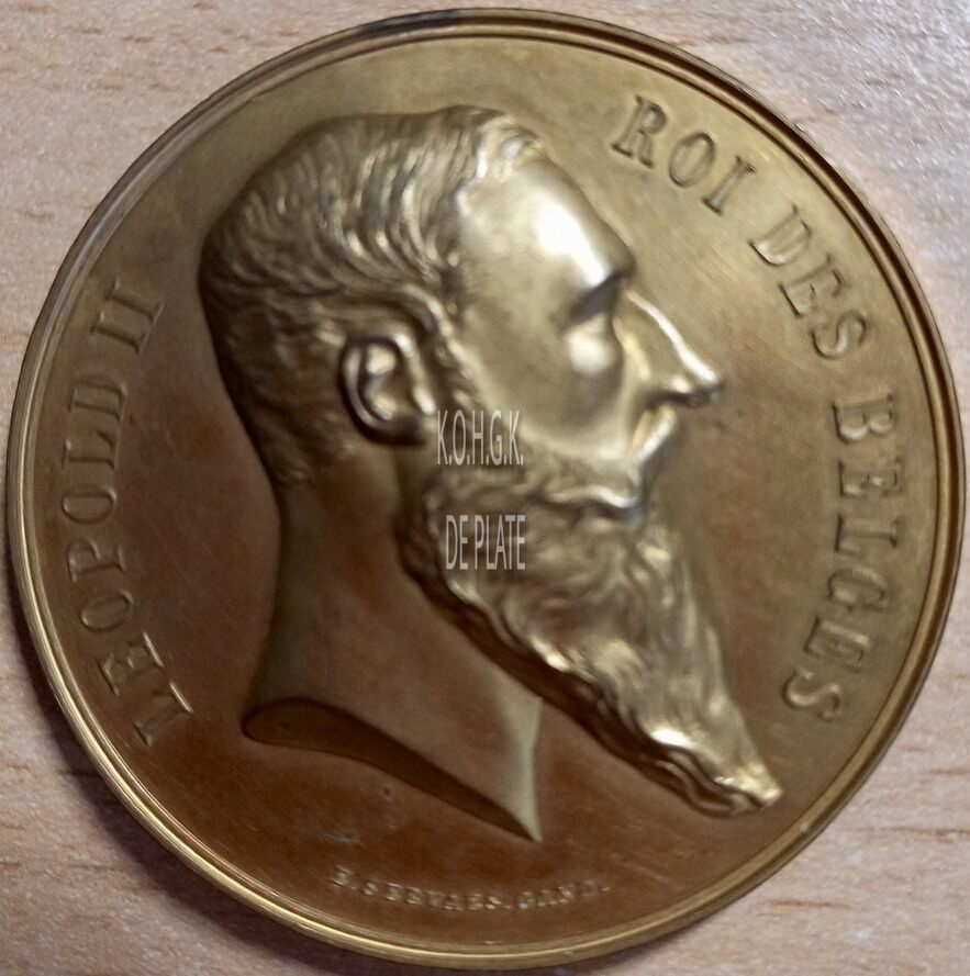 Op de voorzijde : Centraal het hoofd van koning Leopold II naar rechts gericht, rondom links LEOPOLD II, rondom rechts ROI DES BELGES, onderaan gesigneerd E. SERVAES. GAND.