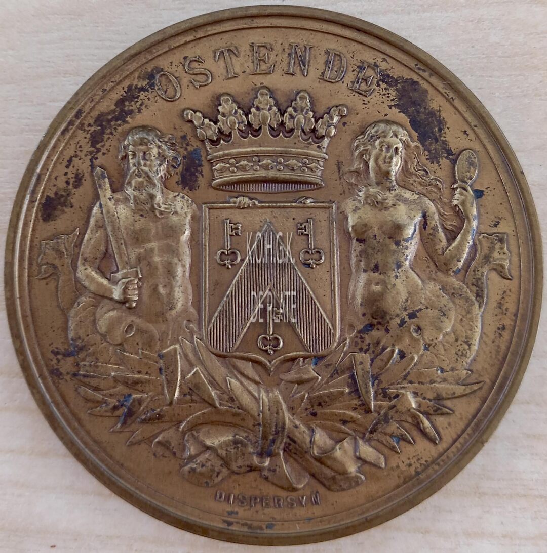 Op de voorzijde : Centraal het gekroonde wapenschild met keper en drie sleutels van de stad Oostende, geflankeerd door twee schildhouders, links meerman met zwaard naar links kijkend, rechts meermin met handspiegel naar rechts kijkend, alles geplaatst op palmbladeren samengebonden met een lint, gesigneerd DISPERSYN