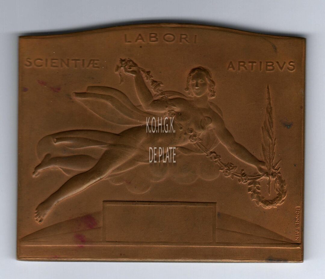 Op de voorzijde : Centraal een gedrapeerde vrouw die naar rechts zweeft met in haar linkerhand een krans en palmtak waaruit een bloemenslinger gaat naar haar rechterhand. In de linker bovenhoek SCIENTIAE, midden boven LABORI, rechter bovenhoek ARTIBVS. onderaan een lege afsnede en erboven een pancarte voor gravure ; rechts langs de rand verticaal en verdiept, de signatuur BONNETAIN