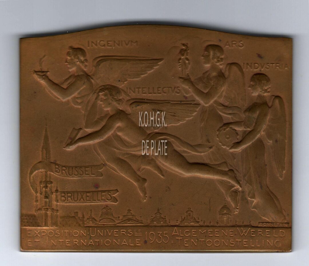 Op de keerzijde : vier engelen die naar links vliegen ; de eerste heeft een schaal met de eeuwige vlam in haar beide handen en boven haar hoofd staat, INGENIVM ; de tweede houdt een blad in haar linkerhand terwijl haar rechterhand op haar voorhoofd rust en boven haar staat, INTELLECTVS ; de derde draagt een beeldje en boven haar staat, ARS ; de laatste heeft een tandwiel en boven haar staat, INDVSTRIA ; onder hen een panorama van de stad Brussel met links op een banderol rond de toren van het stadhuis, BRUSSEL / BRUXELLES. Onderaan op de afsnede verdiept, in het midden, I935, links ervan ; EXPOSITION UNIVERS LE / ET / INTERNATIONALE ; rechts, ALGEMEENE WERELD / = TENTOONSTELLING. Aan de voeten van de vierde engel de signatuur BONNETAIN