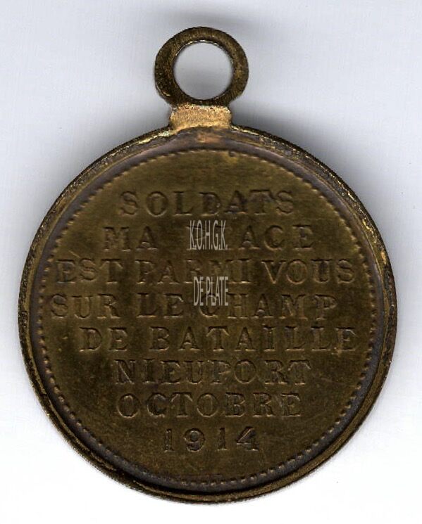 Op de keerzijde : rondom een parelrand, horizontaal SOLDATS / MA PLACE / EST PARMI VOUS / SUR LE CHAMP / DE BATAILLE / NIEUPORT / OCTOBRE 1914