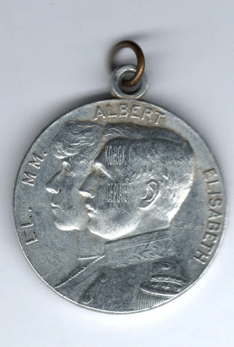Op de voorzijde : De gekoppelde borstbeelden van Albert I in uniform en Elisabeth met halssnoer naar links gericht, rondom links LL. MM., rondom boven ALBERT, rondom rechts ELISABETH, rechts horizontaal L. CARIAT