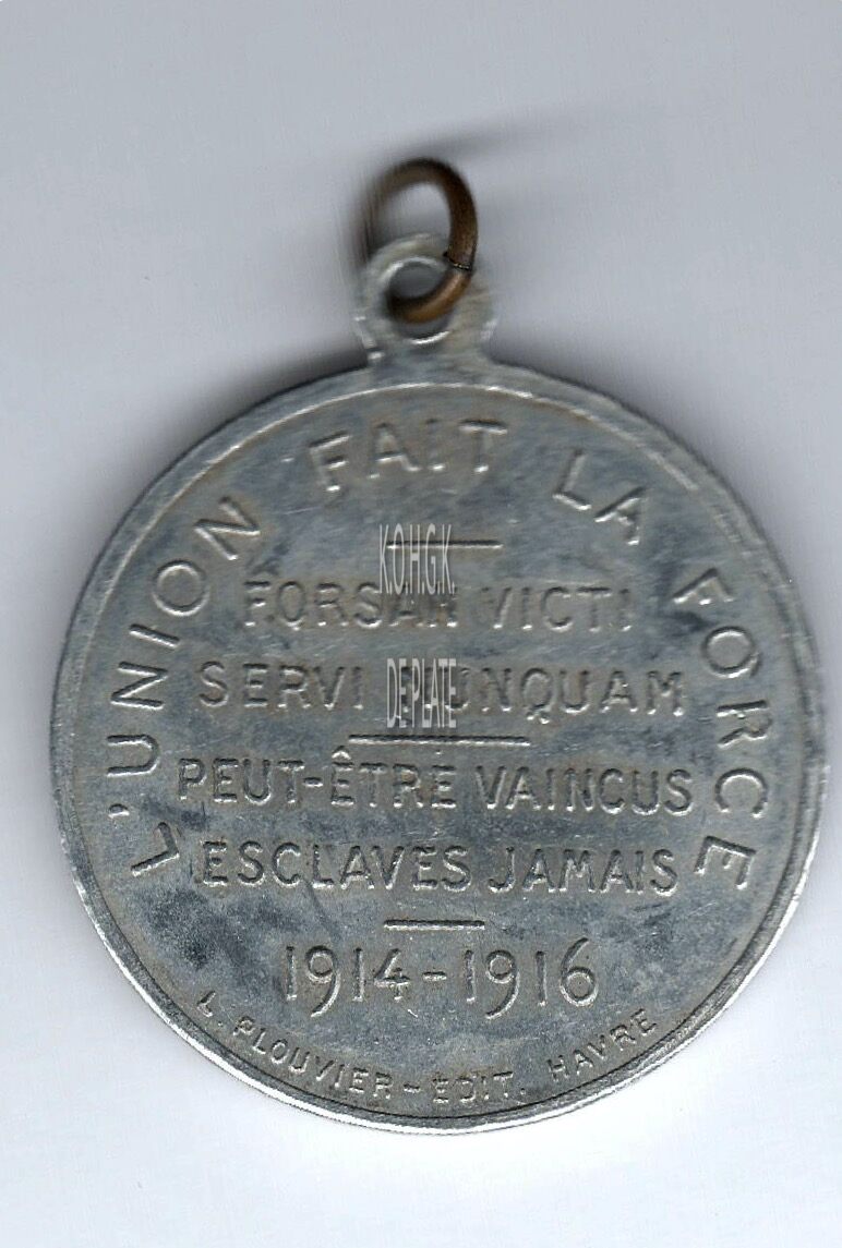 Op de keerzijde : rondom boven L’UNION FAIT LA FORCE, horizontaal -- / FORSAN VICTI / SERVI NUNQUAM / -- / PEUT-ETRE VAINCUS / ESCLAVES JAMAIS/ 1914-1916, rondom onder PLOUVIER-EDIT.HAVRE