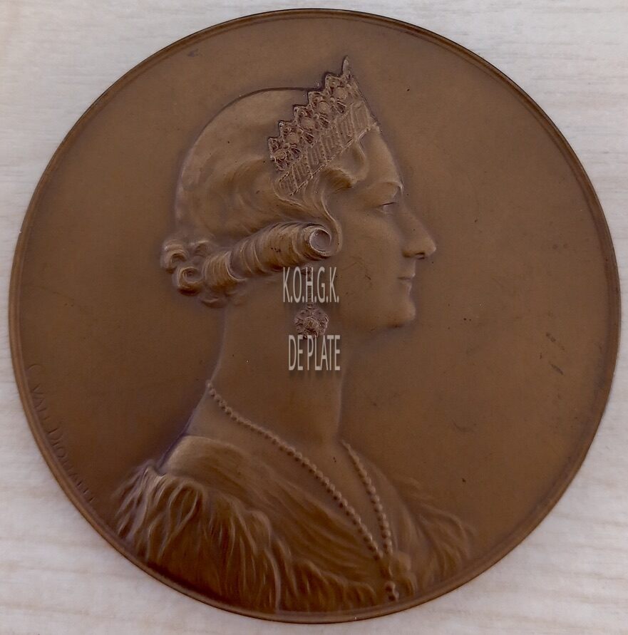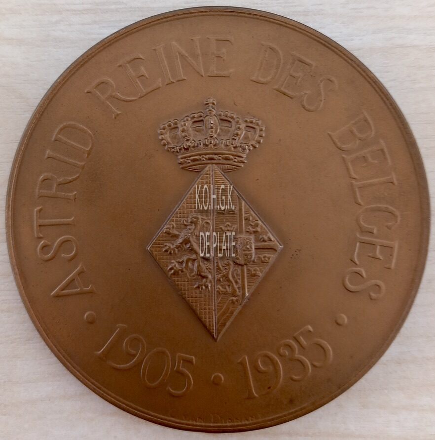 Op de keerzijde : rondom boven • ASTRID REINE DES BELGES •, rondom onder 1905 • 1935, centraal het gekroonde wapenschild van Astrid, onderaan gesigneerd C. VAN DIONANT