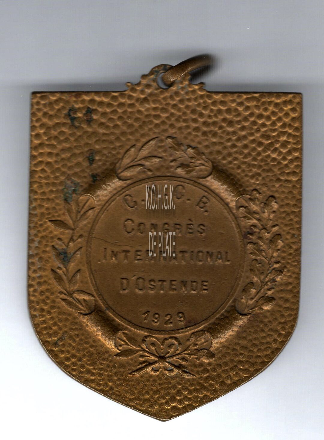 Op de keerzijde : centraal in een cirkel rondom boven C.N.C.B., horizontaal Congrès International d’Ostende, rondom onder 1929