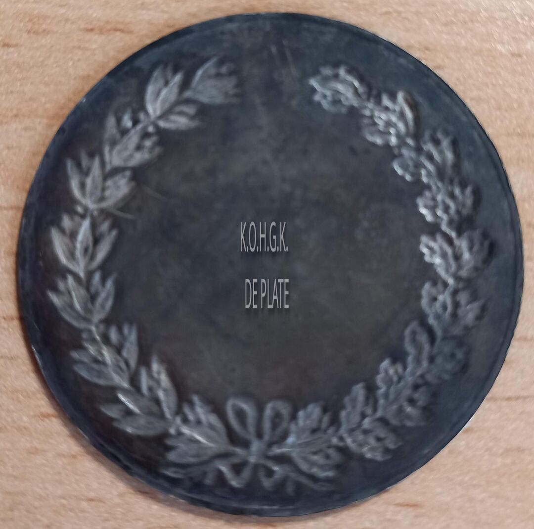 Op de voorzijde : rondom links een eikentak, rondom rechts een lauriertak onderaan samengestrikt, centraal horizontaal EENDRAGT EN VREUGD / OOSTENDE