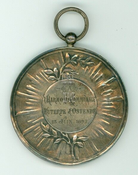 Op de keerzijde : centraal verticaal een lauriertak, rondom zonnestralen daar op centraal in een medaillon horizontaal A / L’HARMONIE COMMUNCAL / EUTERPE D’OSTENDE / 15 JUIN 1897