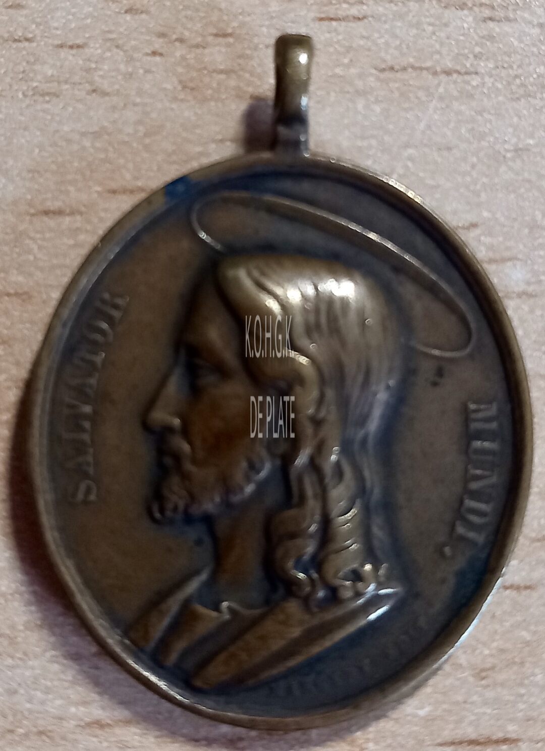 Op de keerzijde : rondom links SALVATOR, rondom rechts MUNDI, centraal het borstbeeld van Jezus Christus met aureool naar links gericht