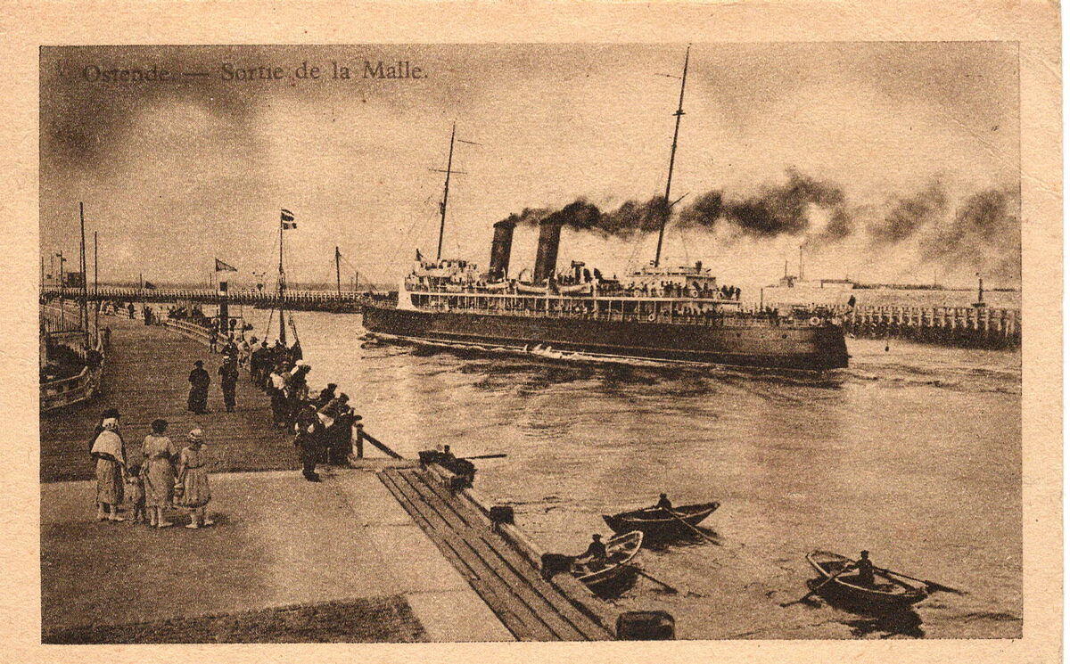 Ostende - Sortie de la Malle. - De havengeul vanaf het Weststaketsel. Een pakketboot van de Oostende - Dover lijn verlaat de haven.