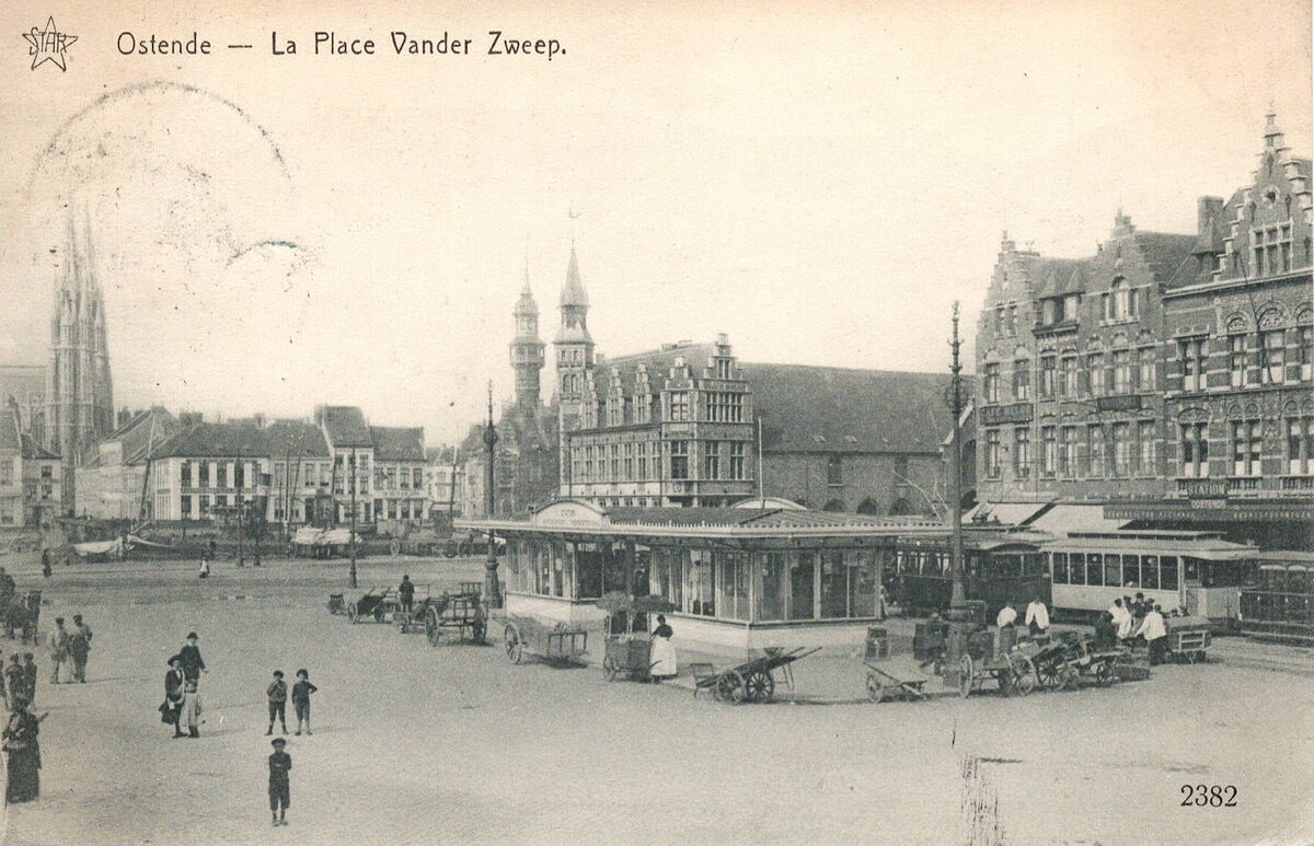 Héliotypie De Graeve, Gand. Star, N° 2382. - Ostende - La Place Vander Zweep. - Het tramwachthuisje op de Vandersweepplaats op de Hazegraswijk. Een tram is aangekomen. Op de achtergrond, de Keizerskaai en de torens van de Sint Petrus en Pauluskerk.