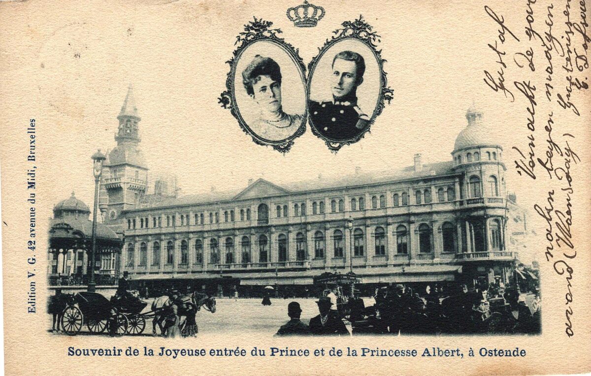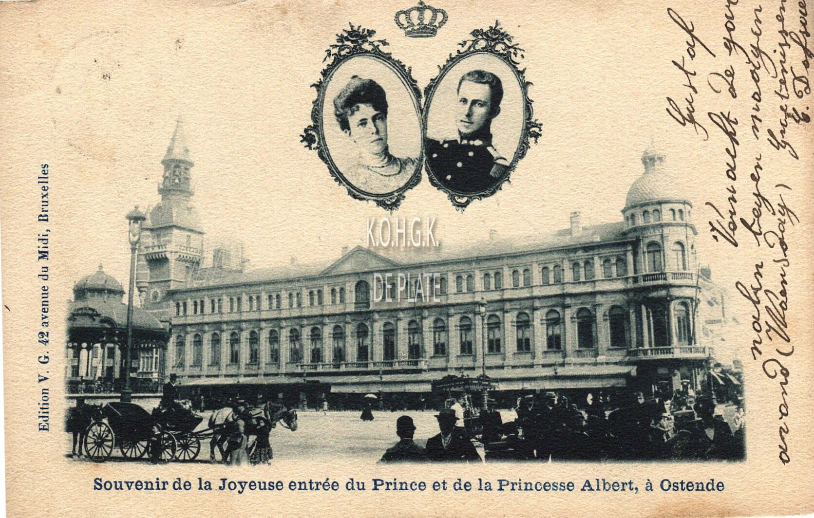 Edition V.G., 42, avenue du Midi, Bruxelles. -Souvenir de la Joyeuse entrée du Prince et de la Princesse Albert, à Ostende. - Het Wapenplein met het stadhuis en links de muziekkiosk. Inzet : Prinses Elisabeth en Prins Albert.