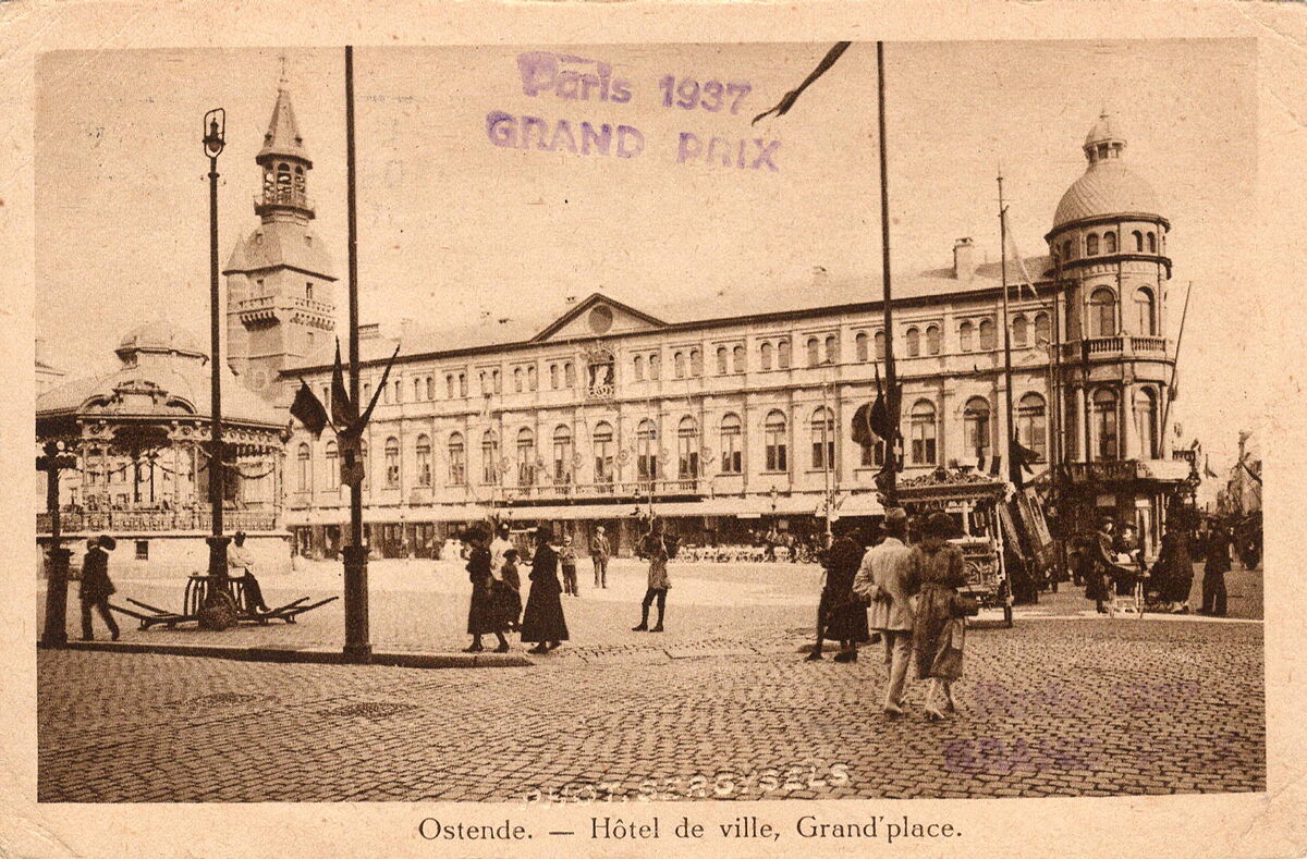 Phot. Sergysels. - Ostende - Hôtel de ville, Grand'place. - Het Wapenplein met het stadhuis. Links, de muziekkiosk