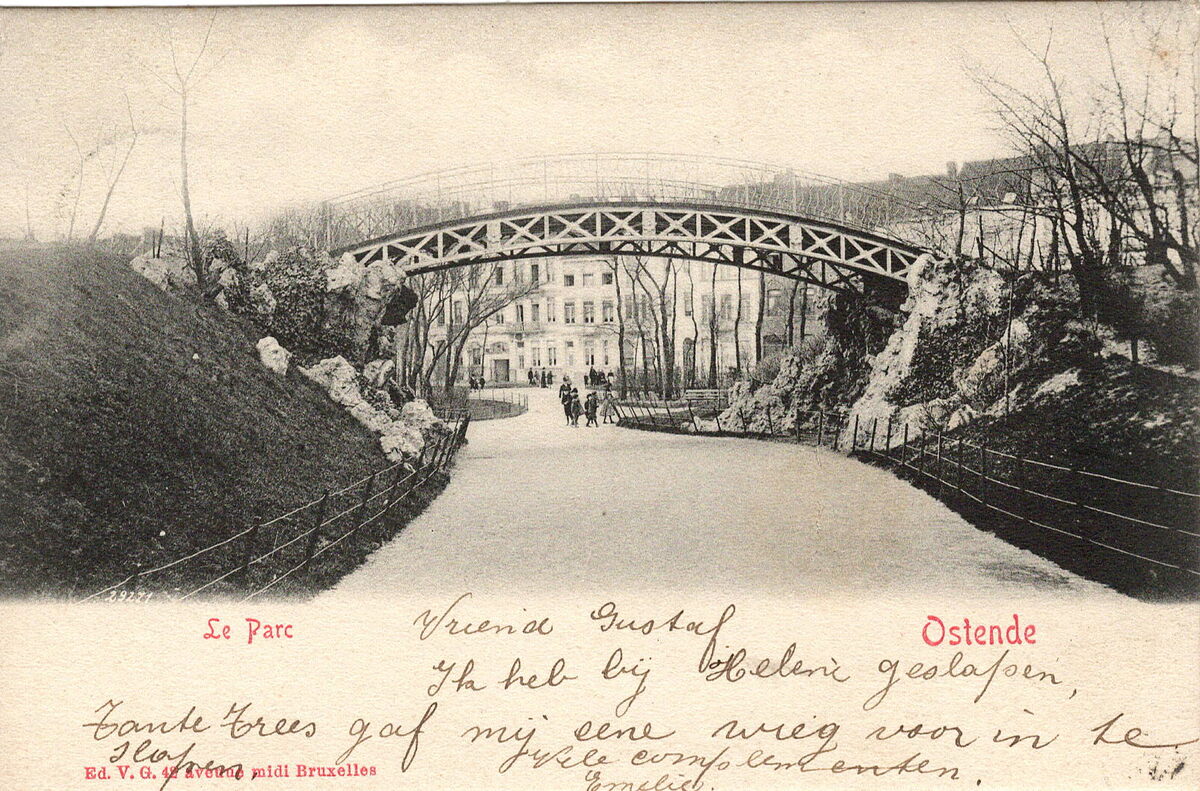 Ed. V.G., 42, avenue midi, Bruxelles. - Ostende - Le Parc. - De ijzeren brug in het Leopoldpark die de verbinding was tussen de fontein en de Trinkhall. Op de achtergrond, de Euphrosina Beernaertstraat