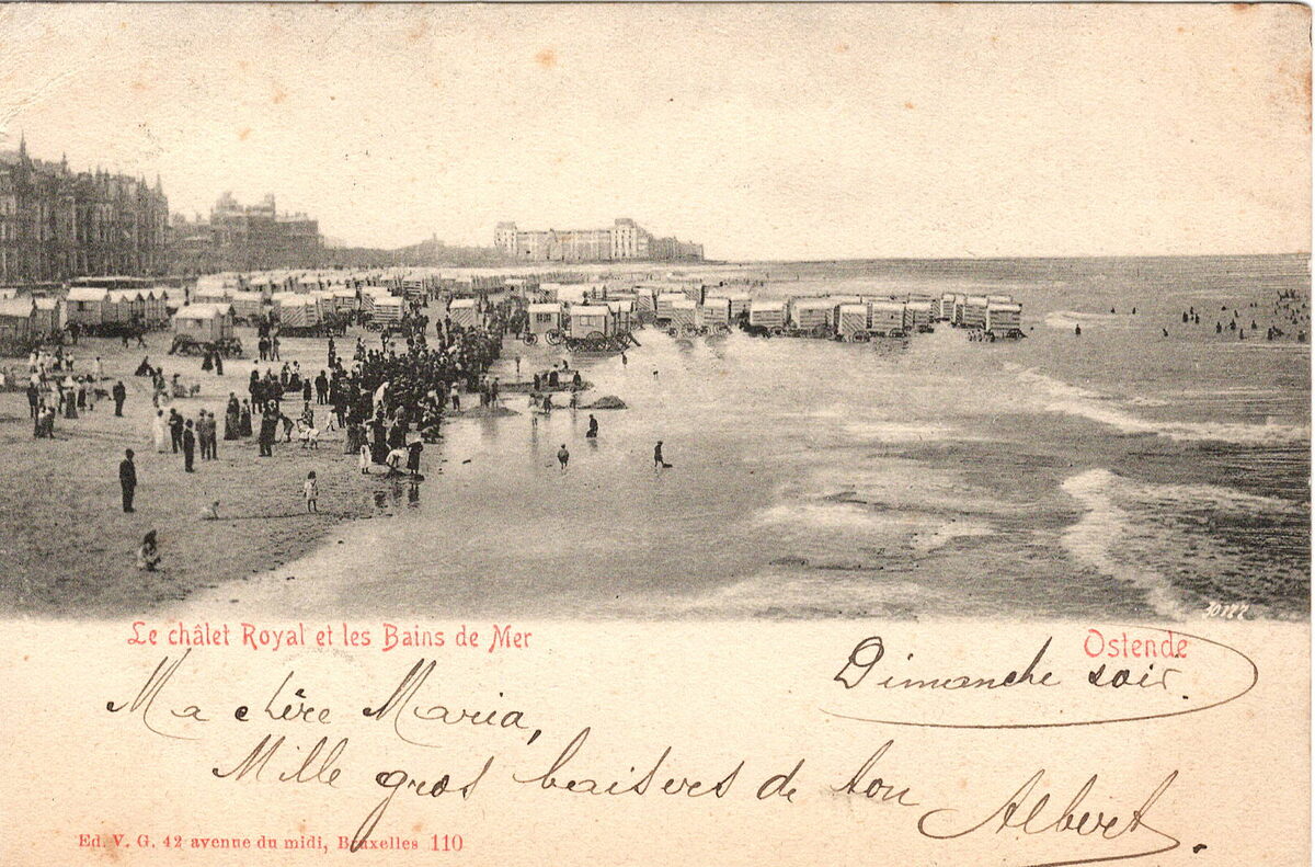 Edit. V.G., 42 avenue du midi, Bruxelles, N°110. - Ostende - Le châlet Royal et le Bains de Mer. - Strandrecreatie op het Groot Strand. We zien het Groot Strand vanaf de kursaal richting het "Royal Palace Hotel", met in het midden het Koninklijk Chalet langs de Zeedijk.