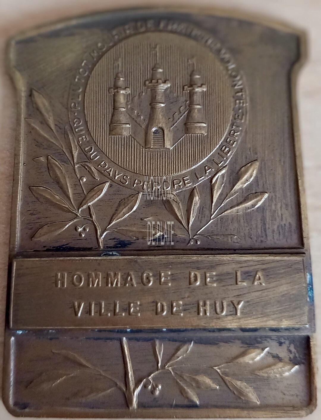 Op de voorzijde : midden boven in een cirkel en fort met drie torens, rond de cirkel boven PLUSTOT MOURIR DE FRANCHE VOLONTE, onder QUE DU PAYS PERDRE LA LIBERTE, daaronder een palmtak met erop een lint met horizontaal HOMMAGE DE LA / VILLE DE HUY