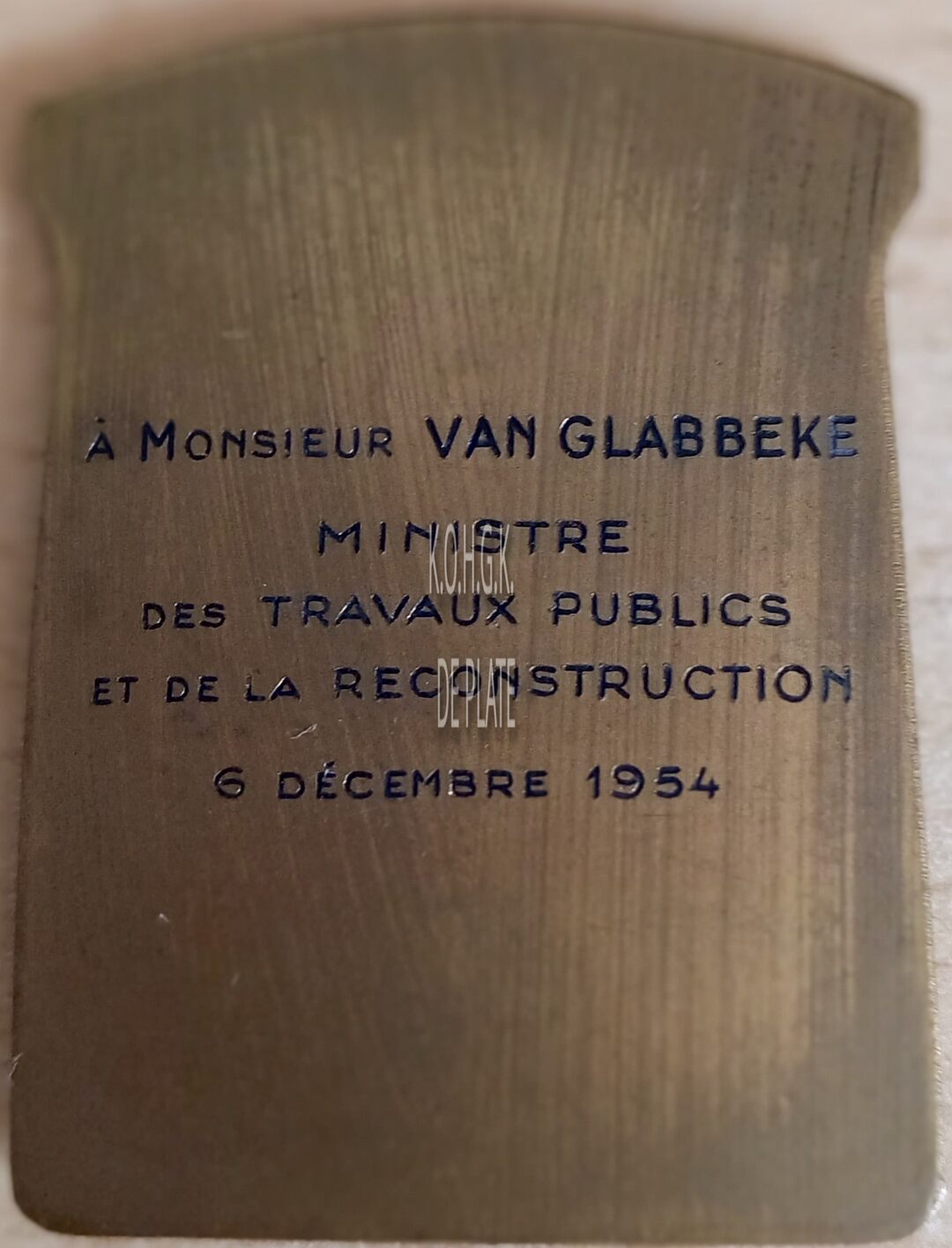 Op de keerzijde : horizontaal A MONSIEUR VAN GLABBEKE / MINISTRE / DES TRAVAUX PUBLICS / ET DE LA RECONSTRUCTION / 6 DECEMBRE 1954
