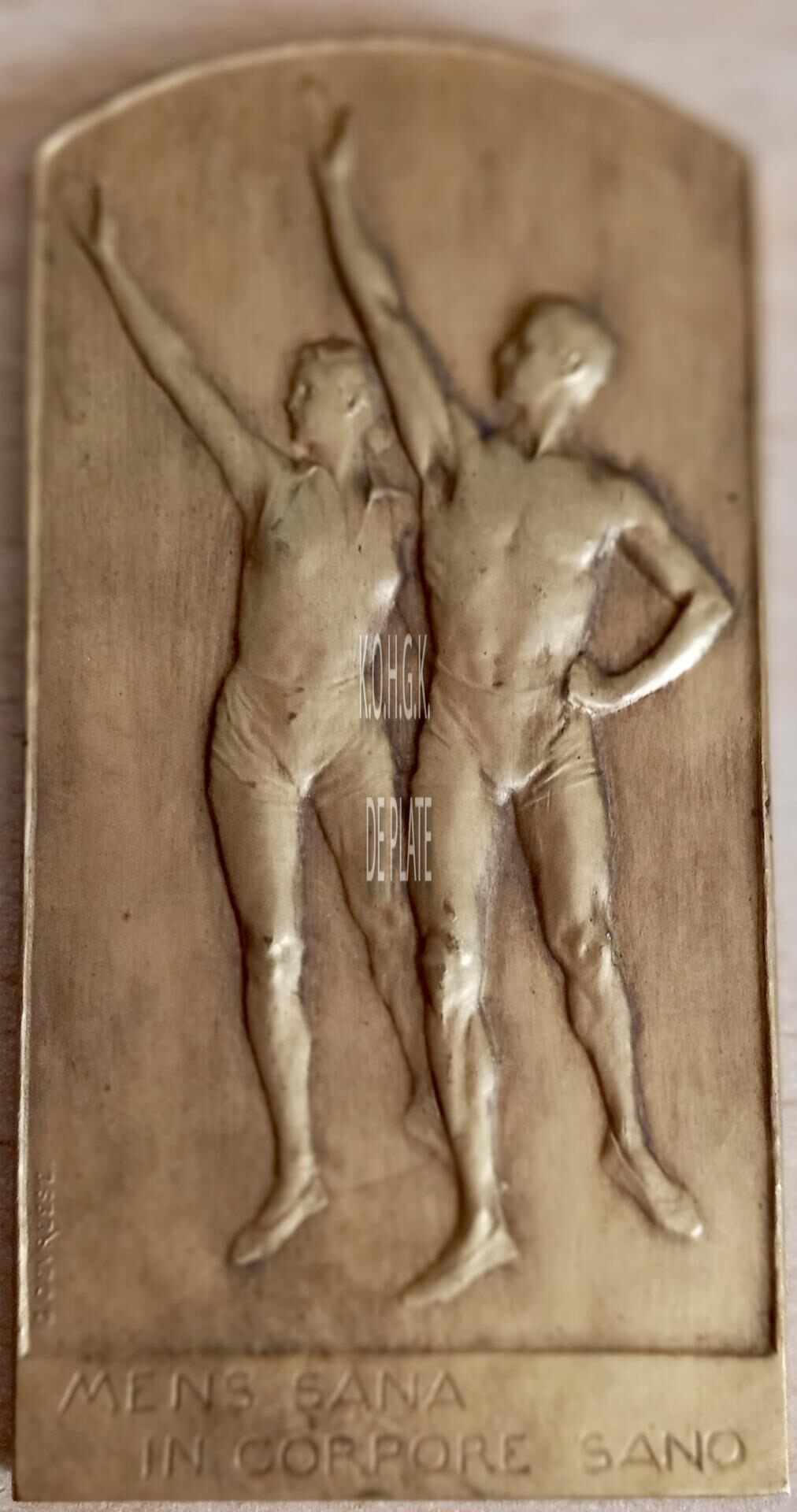 Op de voorzijde : centraal 2 turners (men en vrouw) met opgeheven rechterarm onder de afsnede horizontaal MENS SANA / IN CORPORE SANA