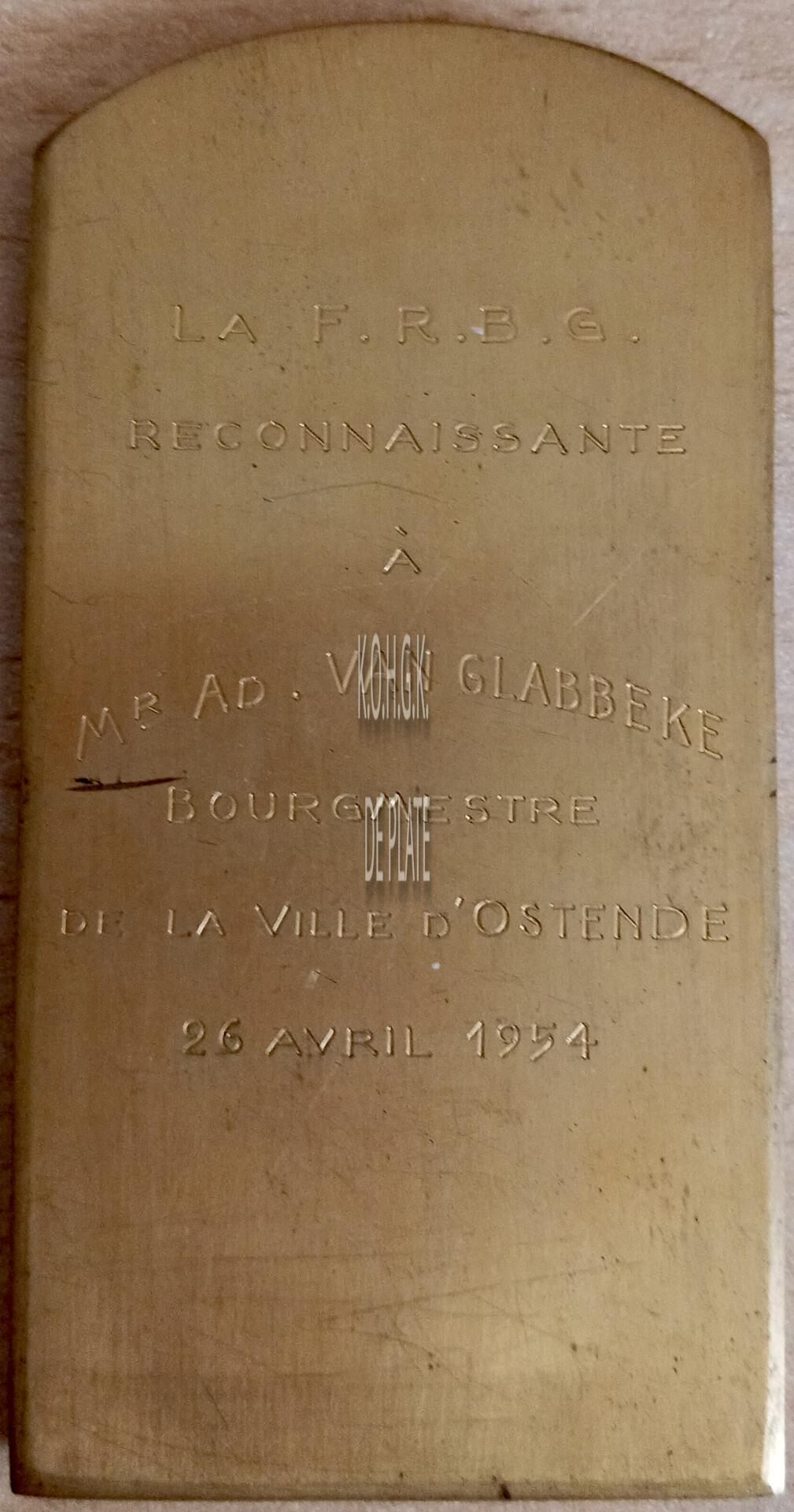 Op de keerzijde : horizontaal LA F.R.B.G. / RECONNAISSANTE / A / MR AD. VAN GLABBEKE / BOUGMESTRE / DE LA VILLE D’OSTENDE / 26 AVRIL 1954