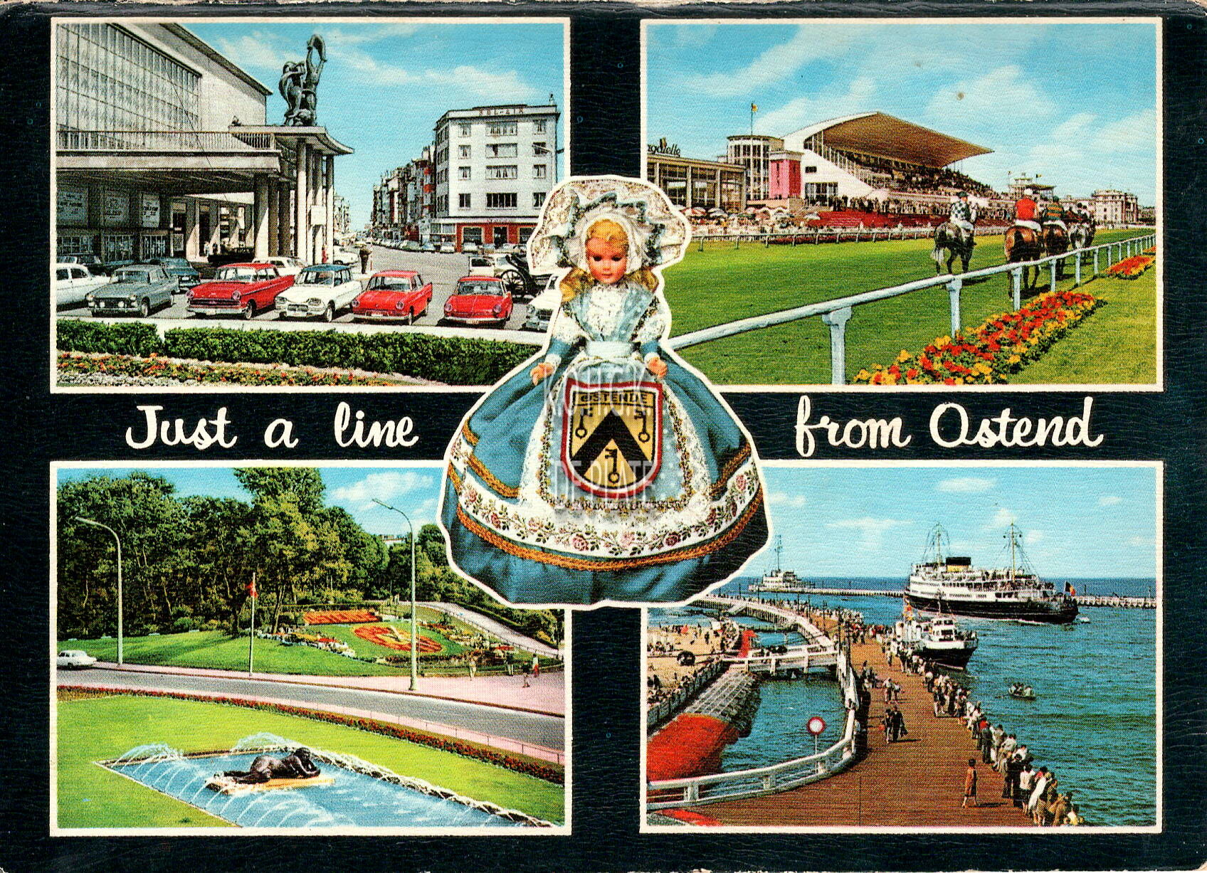 Krüger, N° 933/127. - Groeten uit. Un bonjour d'. Greetings from. Grüsse aus Oostende. - Inzet : De hoofdingang van de vierde kursaal langs de Van Iseghemlaan ; De Wellingtonrenbaan : "De Zee" van George Grard langs de Leopold II-laan en het bloemenuurwerk in het Leopoldpark ; De havengeul met het Weststaketsel en een pakketboot van de Oostende Dover lijn ; Poppetje met wapenschild van Oostende