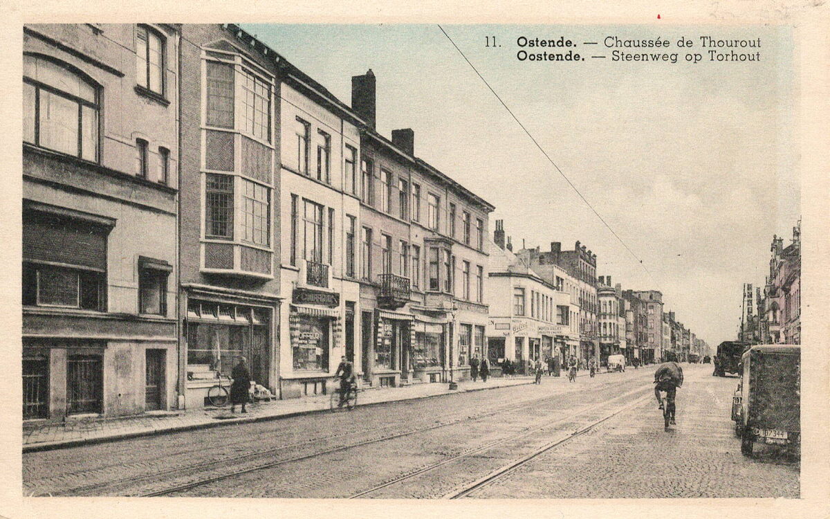 Gegy, N° 11. - Ostende - Chaussée de Thourout. Oostende - Steenweg op Torhout. - De Torhoutsesteenweg gezien vanaf het kruispunt "Petit Paris", met links op de hoek met de Grensstraat, de moto- en rijwielenhandel van R. Degryse en Zoon, Torghoutsesteenweg 100
