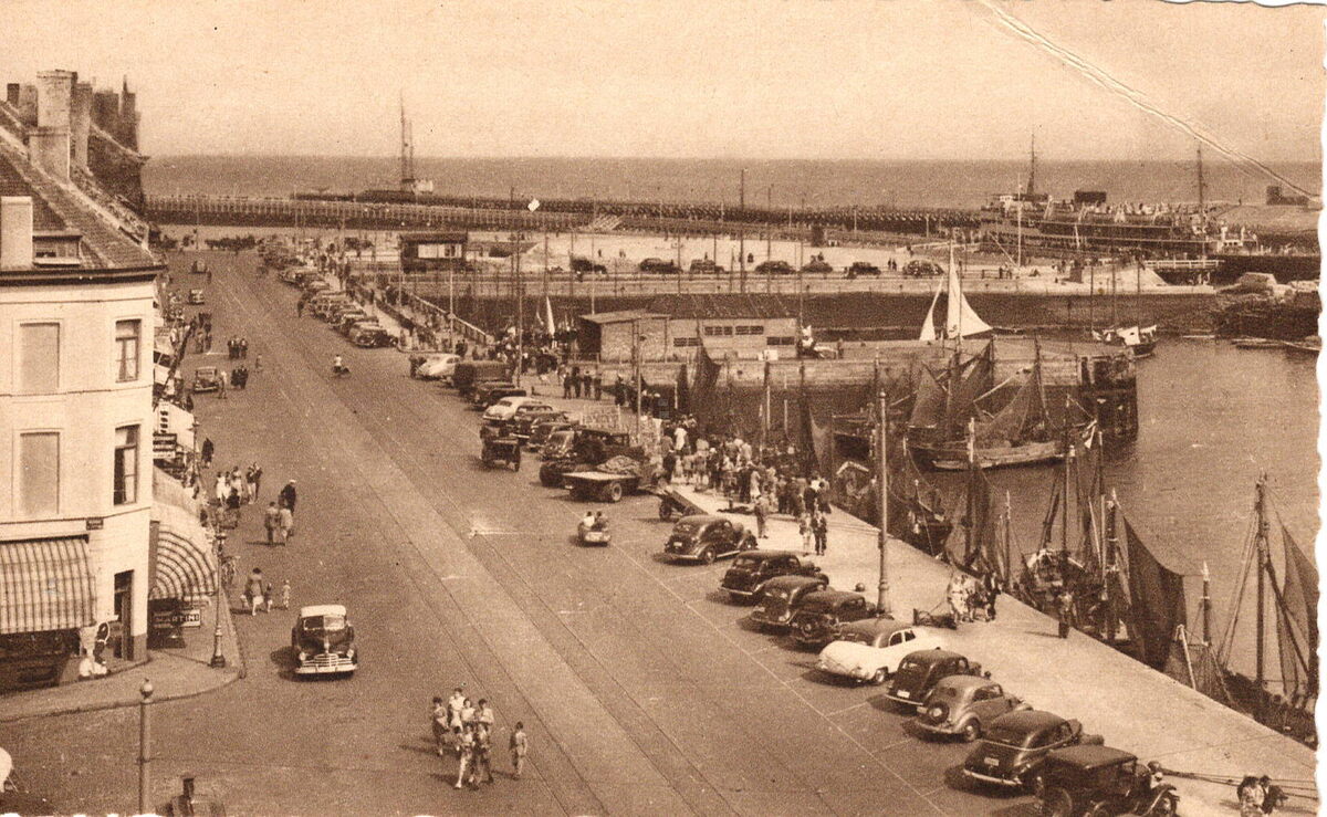 Ed. Bazar d'Ostende, 72 rampe de Flandre, N° 19. - Ostende - Quai des Pêcheurs. Visserskaai. - Mooie opname van de Visserskaai. Kustvissersvaartuigen aangemeerd in het Montgomerydok. De vistrap en wat verder de kaai die de verbinding is tussen de Visserskaai en de Royal North Sea Yachtclub. Sedert 1971, de Montgomerykaai. Een pakketboot van de Oostende Dover lijn in de havengeul