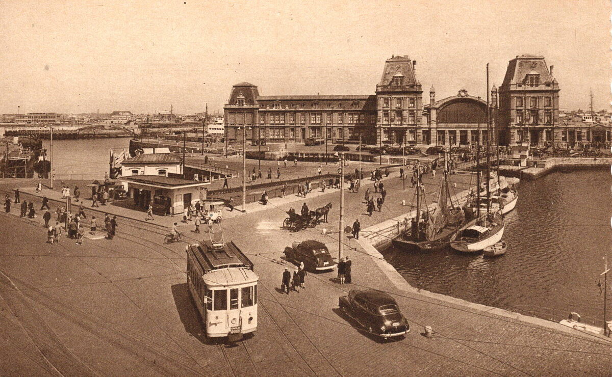 Ed. Bazar d'Ostende, 72 Rampe de Flandre, N°20. - Ostende - Gare Maritime. Zeestation. - Mooi zicht van het Zeestation en zijn omgeving. Vooraan, de Vindictivelaan en een stadstram nabij het wachthuisje "Oostende-Kaai". Er achter, het gebouw voor de sluiswachters en de Visserskreek. Rechts, het eerste handelsdok en de brug over de zeesluis die de verbinding vormt tussen de handelsdokken en de haven.