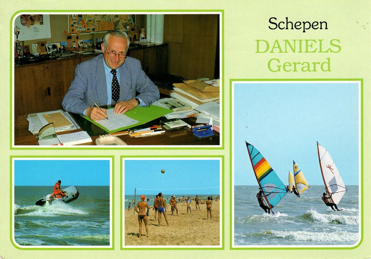 Multikaart. Inzet : Schepen Daniels Gerard aan zijn bureau op het stadhuis ; strandrecreatie : een strandreddingsboot ; strandvolleybal ; windsurfen