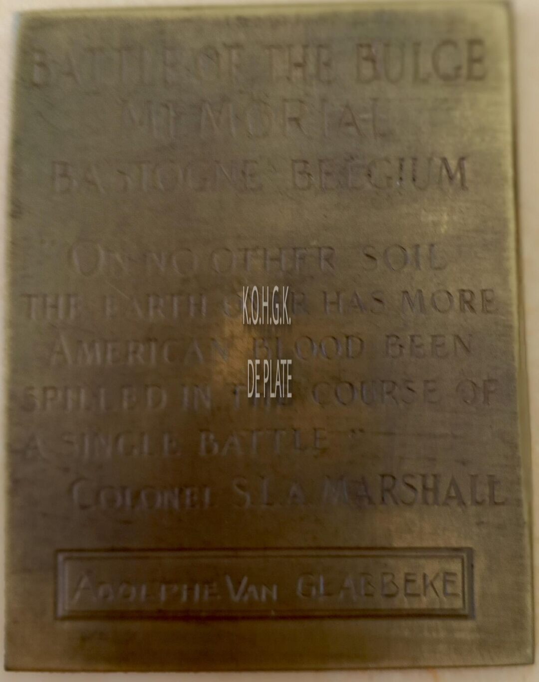 Op de keerzijde : horizontaal BATTLR OF THE BULGE / MEMORIAL / BASTOGNE BELGIUM / O NOOTHER SOIL / THE EARTH OVER HAS MORE / AMERICAN BLOOD BEEN /SPILLED IN THE COURSE OF / A SINGLE BATTLE •• / COLONEL S.L.A. MARSHALL, in een rechthoekig kader ADOLPHE VAN GLABBEKE
