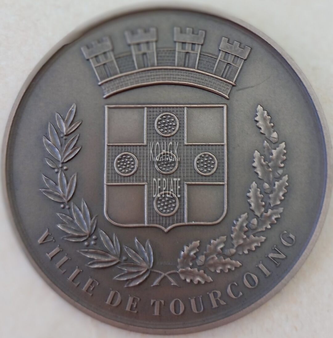 Op de voorzijde : centraal het gekroonde wapenschild van Tourcoing, met links een lauriertak en rechts een eikentak onderaan samengestrikt, rondom onder VILLE DE TOURCOING