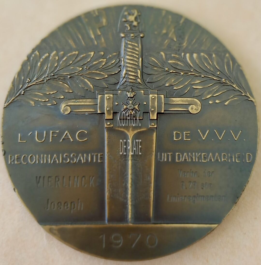 Op de voorzijde : boven rondom PAX, centraal een rechtopstaand zwaard, de pommel van het gevest is versierd met een klauwende leeuw, de greep heeft horizontale lijnen, centraal op de pareerstand de Leopoldsorde, naast het gevest aan beide zijden een palmtak, op de kling het gekroonde wapen van België naast de kling links L’UFAC / RECONNAISSANTE / VRIELINCK / JOSEPH, rechts DE VVV / UIT DANKBAARHEID / VERBR. DER / 3, 23 STE / LINIEREGIMENTEN, onder de afsnede 1970