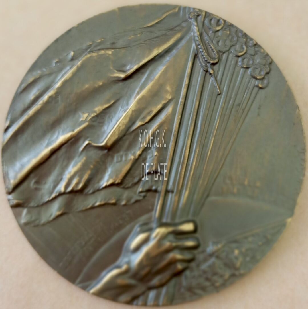 Op de keerzijde : een hand draagt verschillende wapperende vlaggen, onderste helft toont het bovenste van een wereldbol met links EENDRACHT MAAKT MACHT en rechts UNION FAIT LA FORCE, onder een afsnede een wapenschild met leeuw (links) en een wapenschild met haan (rechts) samen onder 1 kroon geplaatst op palmtakken, rechtsonder gesigneerd P. DE SOETE