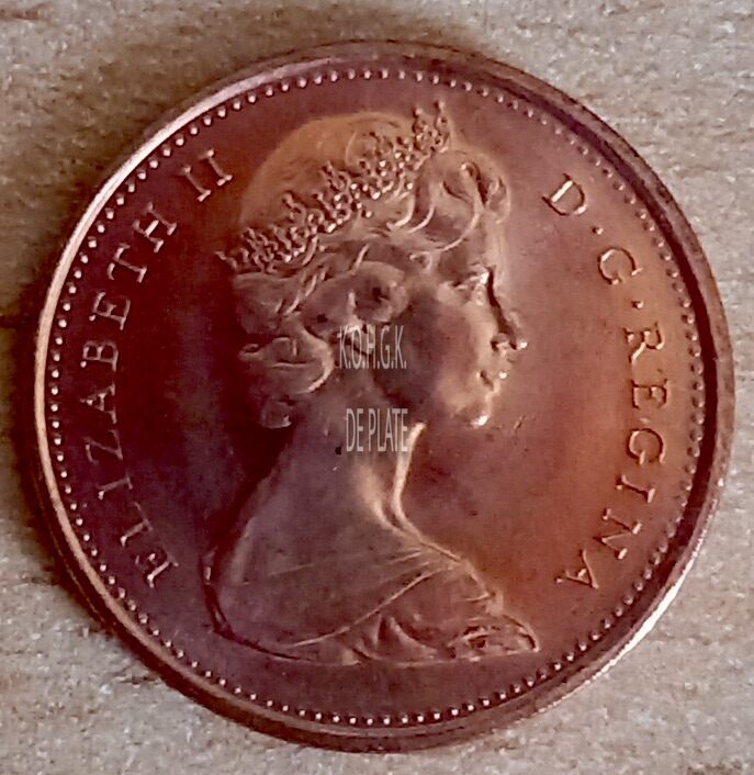 Op de voorzijde : rondom een parelrand, rondom link ELIZABETH II, rondom rechts D. G. REGINA, centraal de buste van koningin Elizabeth II met gekroond hoofd naar rechts gericht.