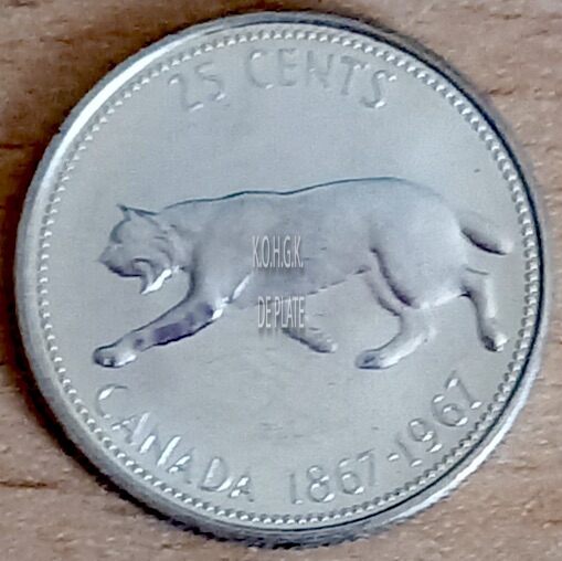 Op de keerzijde : rondom een parelrand, rondom boven 25 CENTS, centraal een lynx, rondom onder CANADA 1867-1967