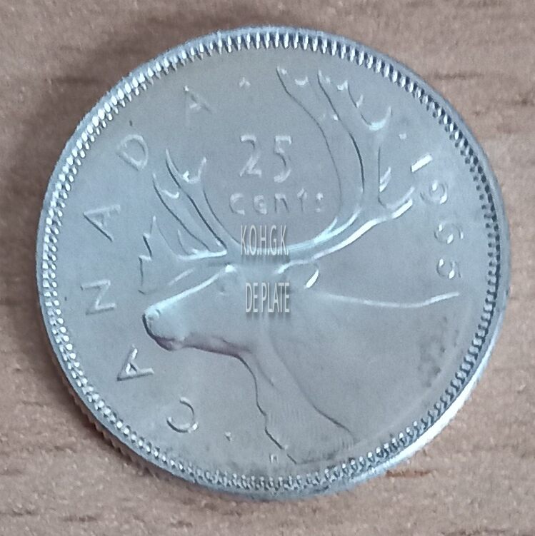 Op de keerzijde : rondom een parelrand, rondom links CANADA, rondom rechts 1965, centraal boven 25 CENTS daaronder een kariboe