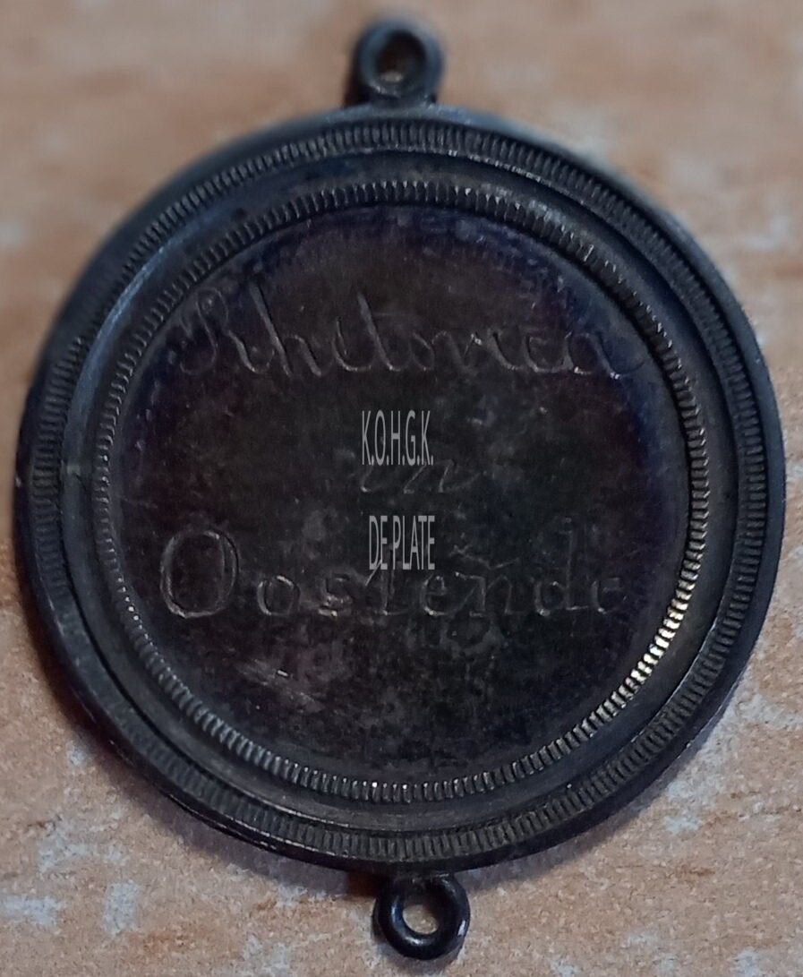 De prijspenning is rond met gladde rand, in een vatting met gladde geprofileerde sierrand, met oog (BOVEN EN ONDER) en ring, en is als volgt ingegraveerd: