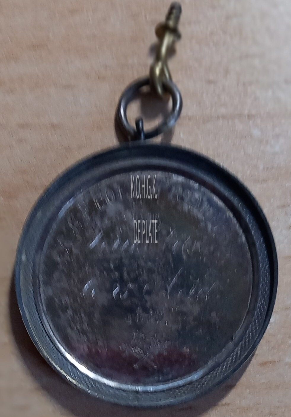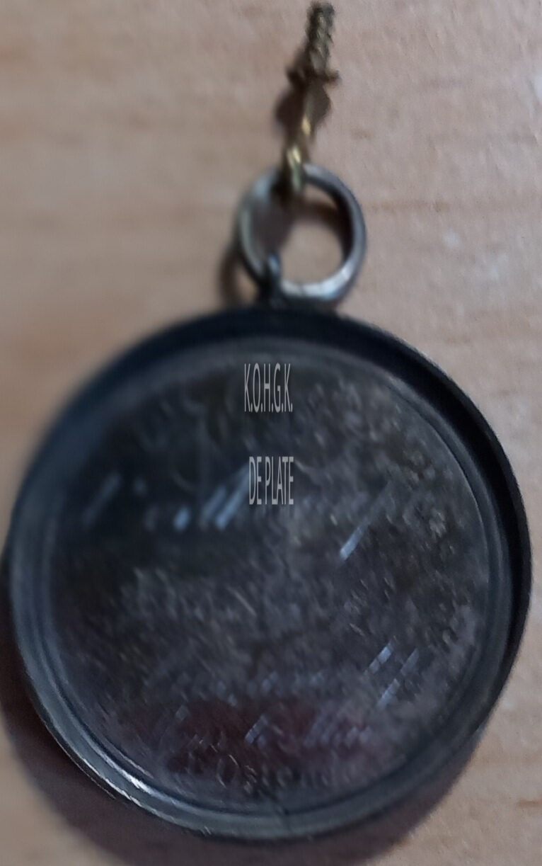 De prijspenning is rond met gladde rand, in een vatting met gladde geprofileerde sierrand, met oog (boven en onder) en ring, en is als volgt ingegraveerd: