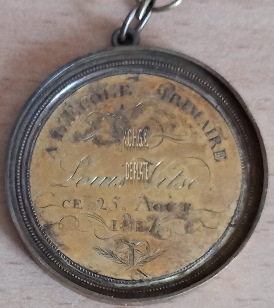 Op de voorzijde : rondom boven A L’ECOLE PRIMAIRE, horizontaal DE / LOUIS VITSE / CE 25 AOUT / 1817