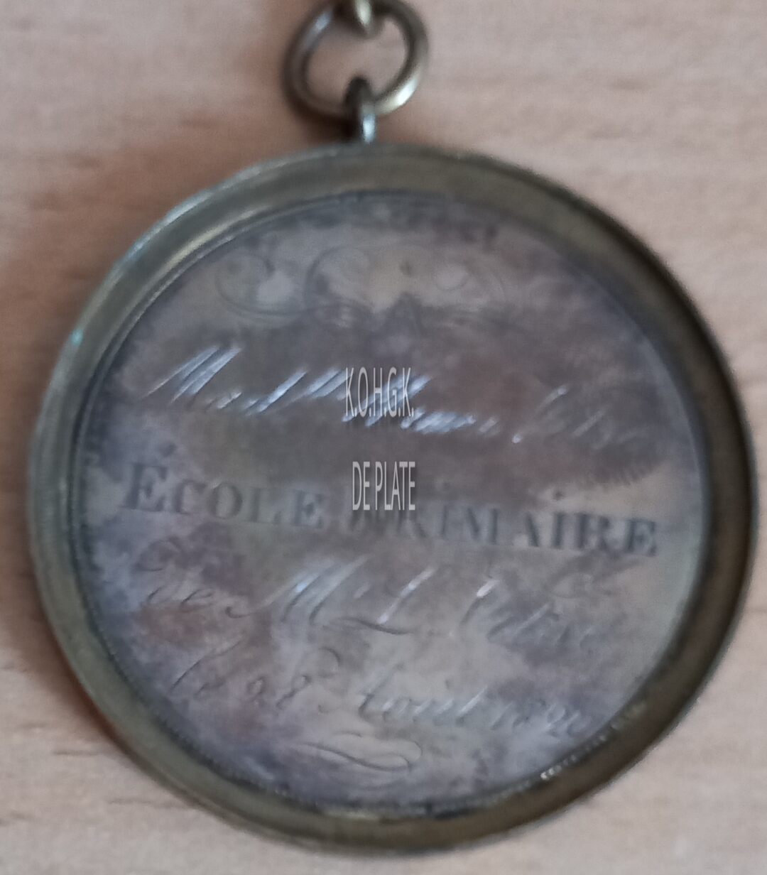 De prijspenning is rond met gladde rand, in een vatting met gladde geprofileerde sierrand, met oog en ring, en is als volgt ingegraveerd: