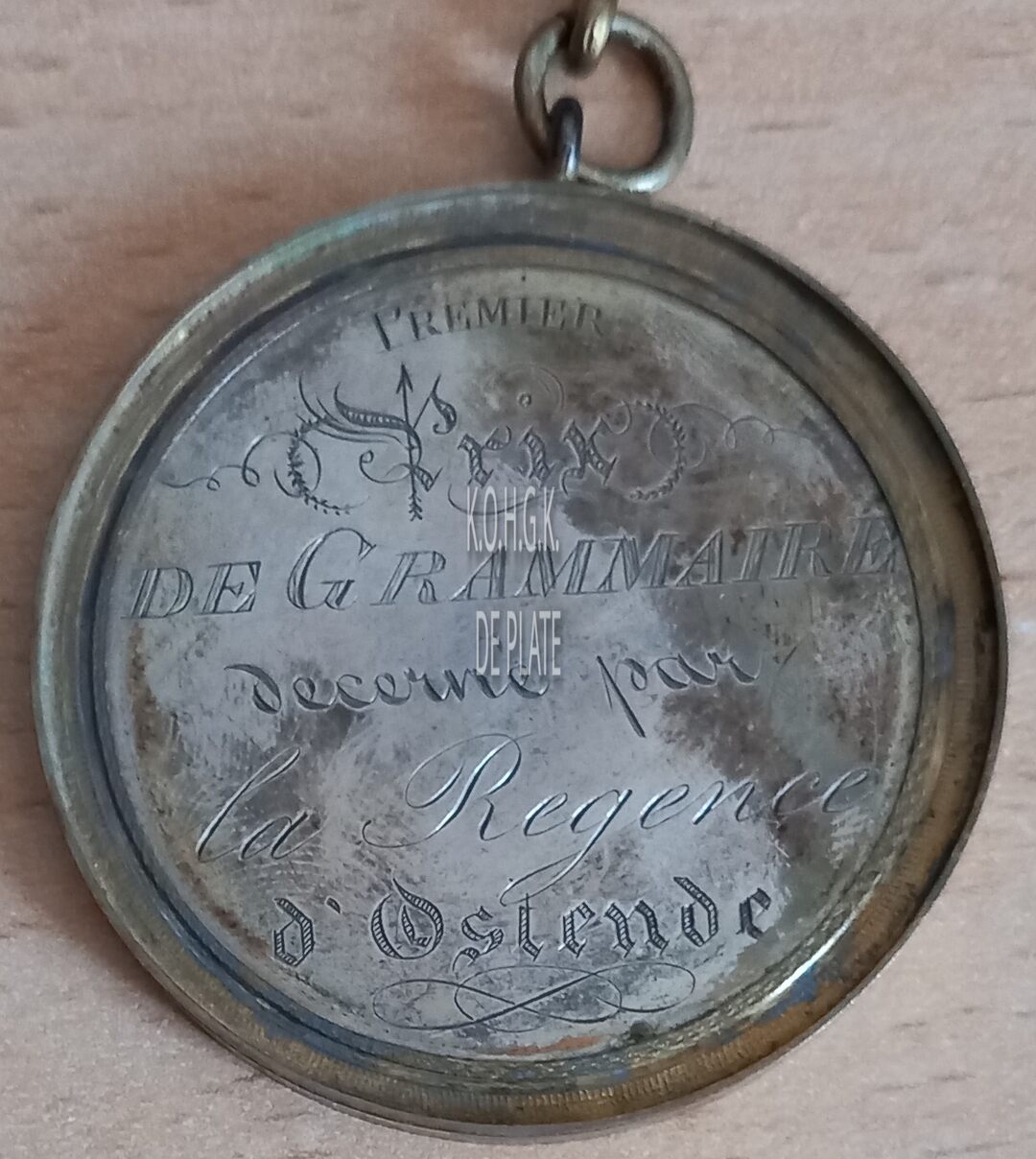 Op de keerzijde : rondom boven PREMIER, horizontaal PRIX / DE GRAMMAIRE / DECERNE PAR / LA REGENCE / D’OSTENDE