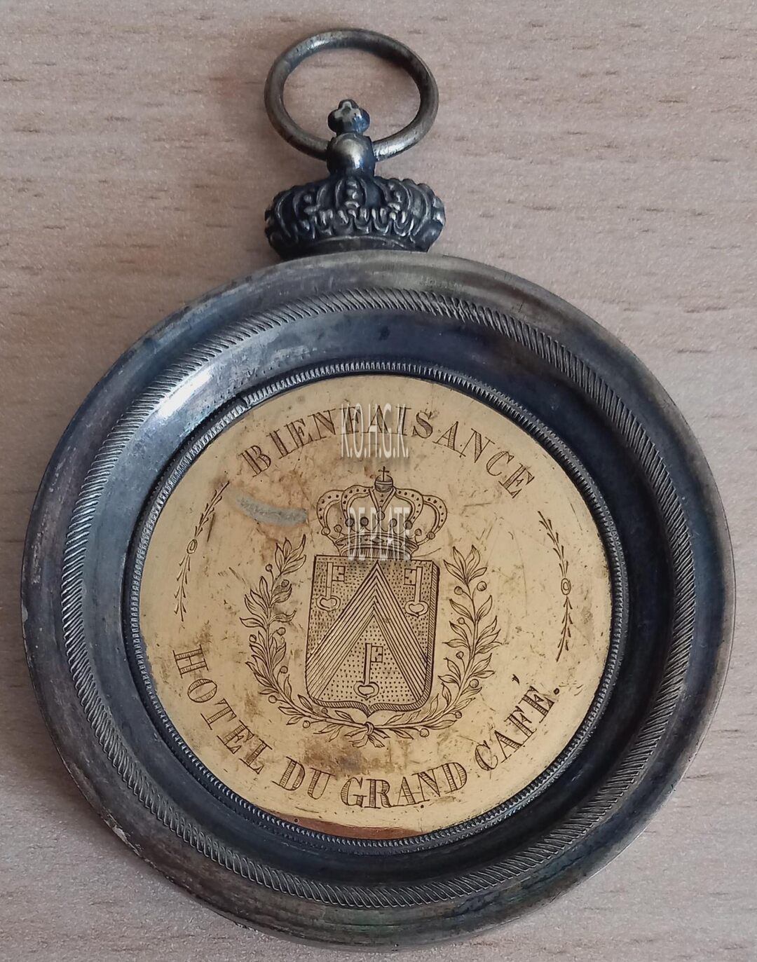 Op de voorzijde : rondom boven BIENFAISANCE, rondom onder HOTEL DU GRANDE CAFE, centraal het gekroonde schild van Oostende met aan weerszijden een lauriertak onderaan samengestrikt.
