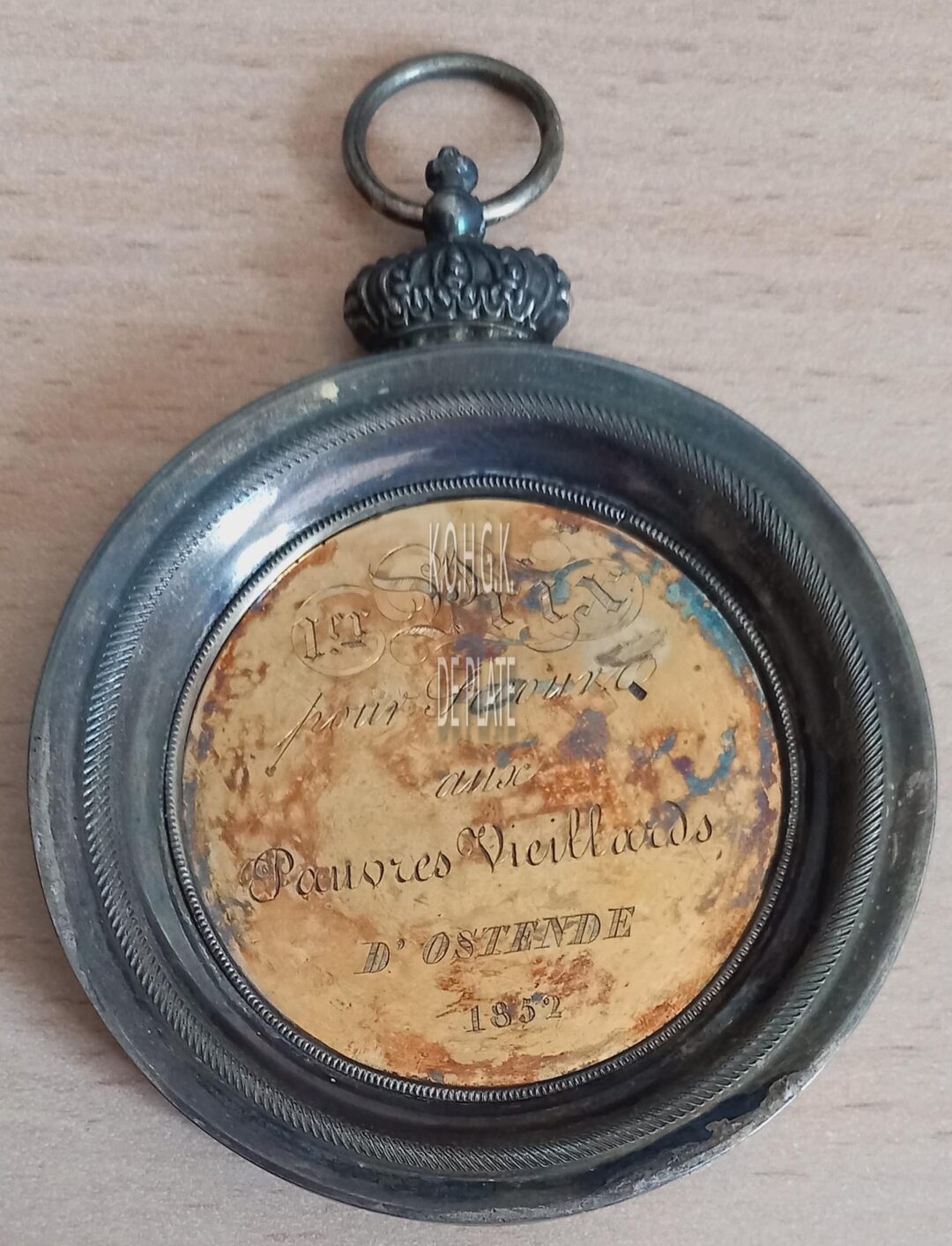 Op de keerzijde : horizontaal 1 er PRIX / POUR SECOURS / AUX / PAUVRES VIEILLARDS / D’ OSTENDE / 1852