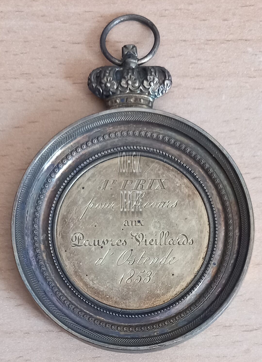 Op de keerzijde : horizontaal 1 er PRIX / POUR SECOURS / AUX / PAUVRES VIEILLARDS / D’ OSTENDE / 1853