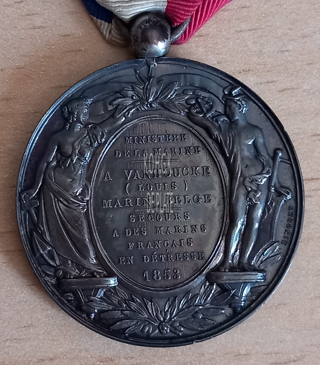 Op de keerzijde : rondom een allegorie: links een halfnaakte vrouw staande op een sokkel met anker, rechts de god Mercurius met zwaard (van Damocles) op een sokkel, de vrouw reikt Mercurius een krans met palmbladeren aan, onder palmtakken samengestrikt. Centraal een medaillon met horizontaal MINISTERE / DE LA MARINE / A VANHOUCKE / (LOUIS) / MARIN BELGE / SECOURS / A DES MARINS / FRANÇAIS EN DÉTRESSE / 1853, links naast het zwaard gesigneerd PINGRET