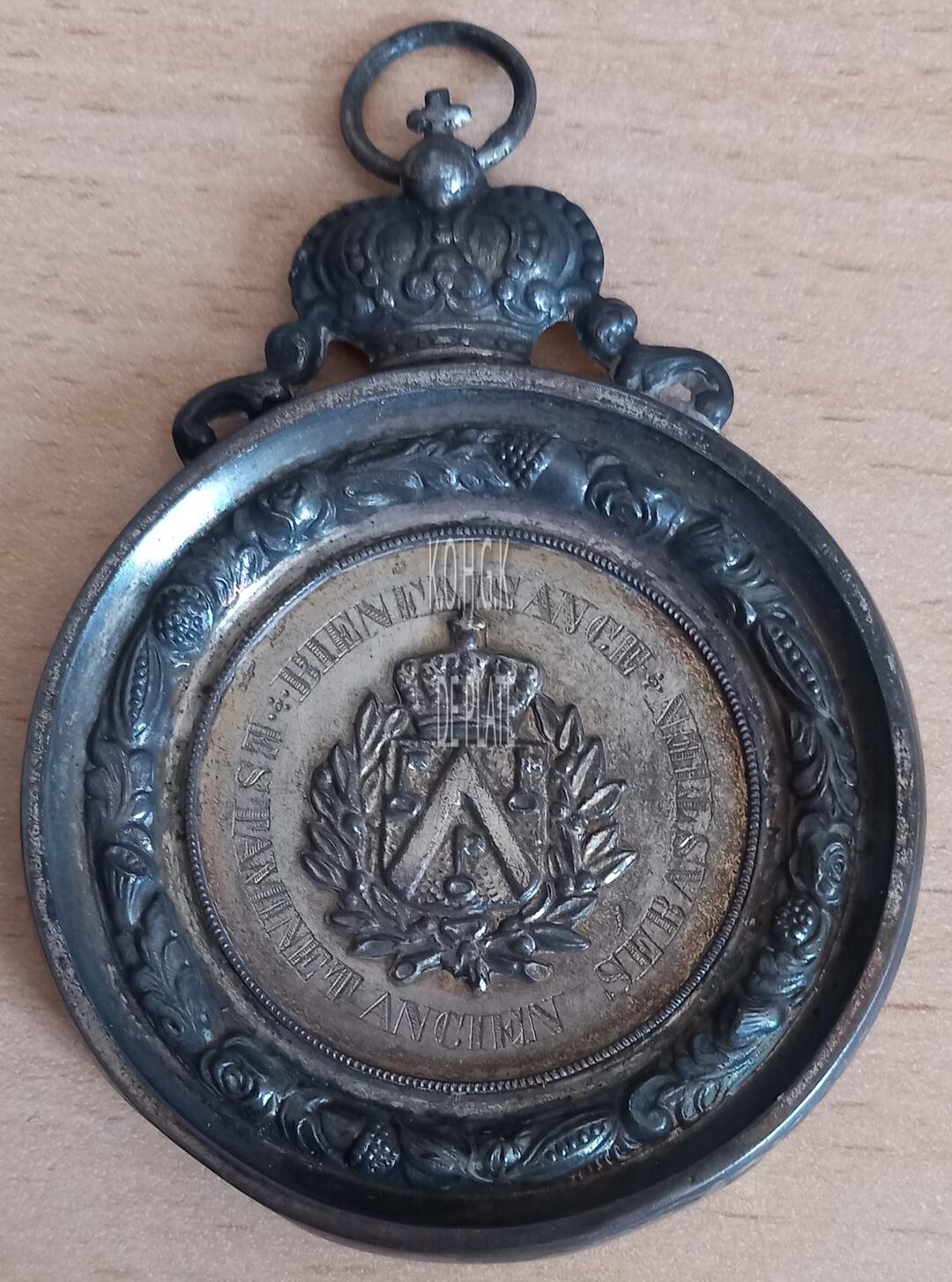 De prijspenning is rond met gladde rand in een vatting met gladde geprofileerde sierrand, kroon met kruis tussen voluut en ring, en is als volgt ingegraveerd: