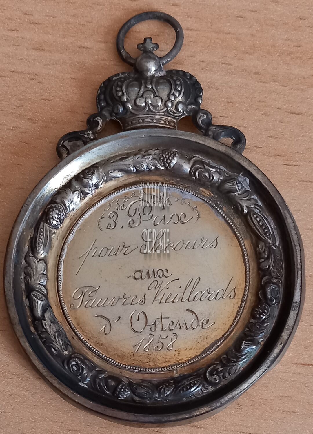 Op de keerzijde : horizontaal 3e PRIX / POUR SECOURS / AUX / PAUVRES VIEILLAARDS / D’OSTENDE / 1858