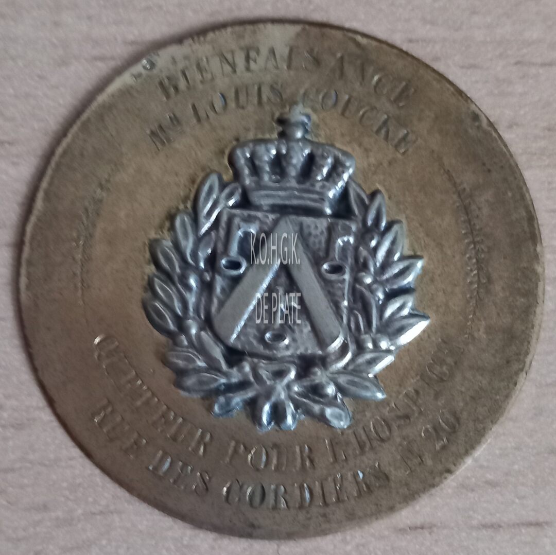 Op de voorzijde : rondom boven BIENFAISANCE / MR. LOUIS COUCKE, centraal het gekroonde wapenschild met keper en drie sleutels van de stad Oostende, met links en rechts een lauriertak onderaan samengestrikt, rondom onder QUETEUR POUR L’HOSPICE / RUE DES CORDIERS N 20