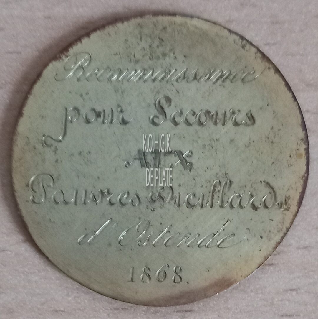 Op de keerzijde : horizontaal RECONNAISSANCE / POUR SECOURS / AUX / PAUVRES VIEILLARDS / D’OSTENDE/ 1868