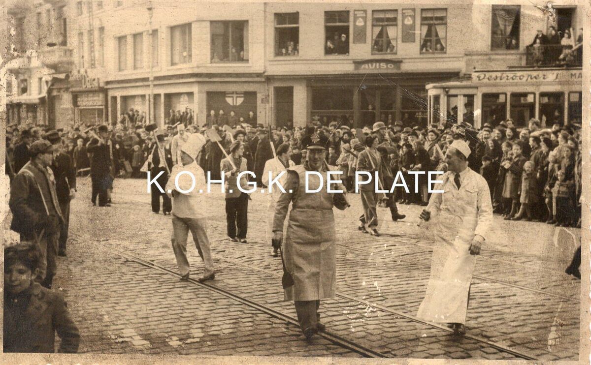 Formaat : 8 x 13 cm. - Foto werd genomen vanuit de Alfons Pieterlaan aan het Kruispunt "Petit Paris”, hoek Torhoutse- en Nieuwpoortsesteenweg. In de achtergrond apotheek Beuselinck, en rechts daarvan café Aviso. Dat was het lokaal van de Oostendse fietsvereniging “Ostend Stadium” en de vogelpikclib "Aviso"