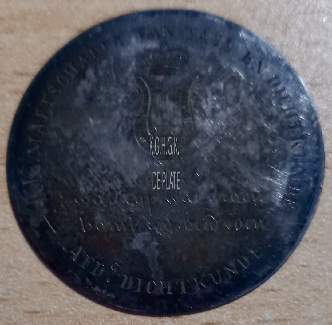 Op de voorzijde : rondom boven K.K. MAETSCHAPPY VAN VADERLANDSCHE TAEL EN DICHTKUNDE, centraal een gekroonde lier,horizontaal onder WAT RIJP WAT GROEN, / KOMT WIJSHEID VOEN, rondom onder – AFD. DICHTKUNDE –